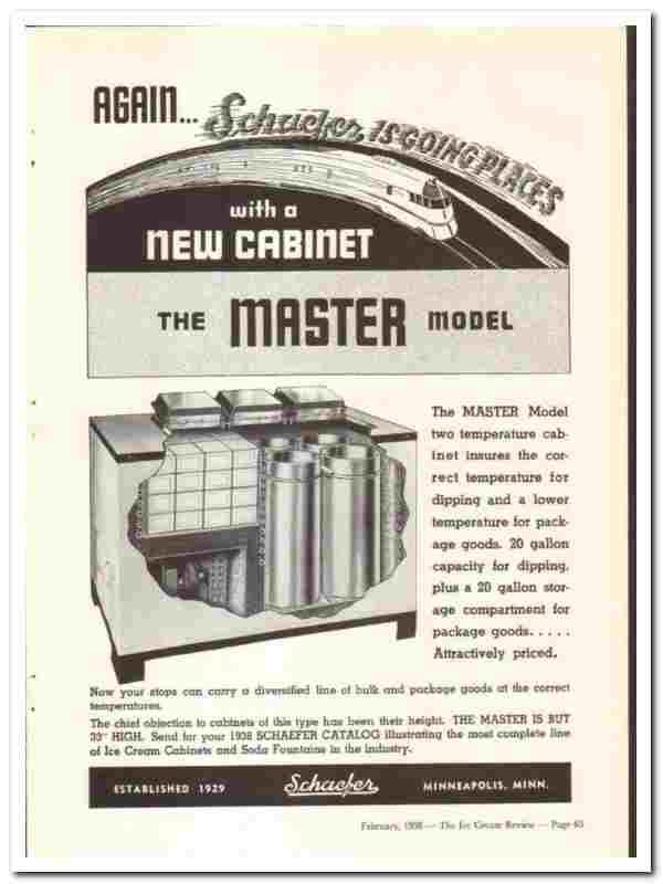Manufacturers of Cabinets for the Ice Cream Industry. 'Again Schaefer is Going Places with a New Cabinet'. 'The Master Model'.
