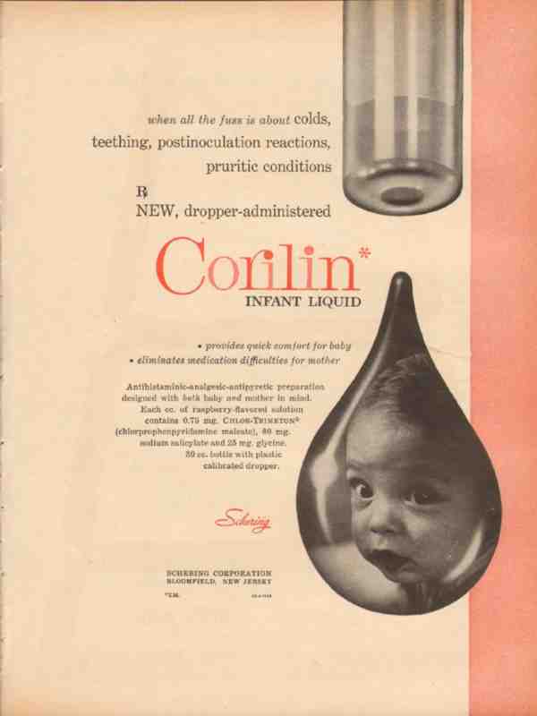Original old medical doctor pharmaceutical trade magazine vintage ad for SCHERING CORPORATION of Bloomfield NJ. When All the Fuss is About Colds, Teething, New Dropper Administered Corilin Infant Liquid Provides Quick Comfort for Baby. This 1959 magazine advertisement would display beautifully matted and framed.