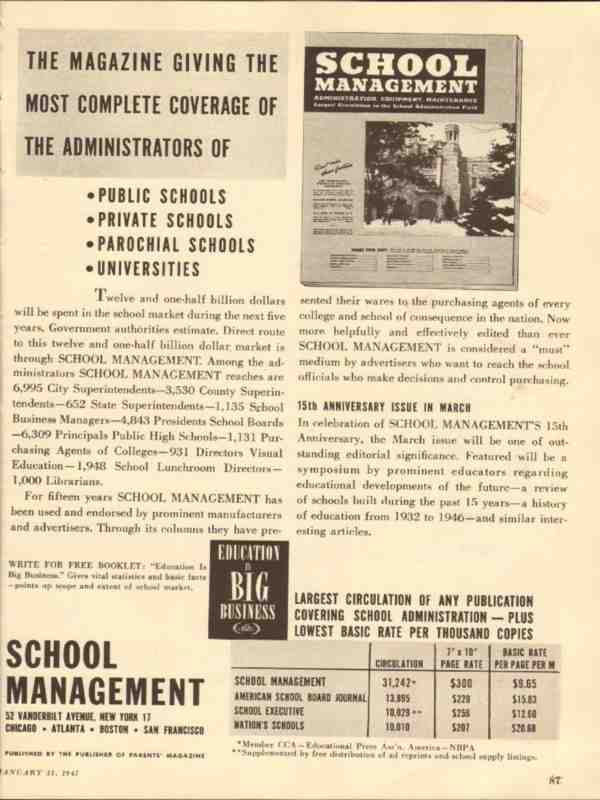 Original vintage media trade magazine ad for SCHOOL MANAGEMENT Magazine of New York City, NY. The Magazine giving the most complete coverage of the administrators of public, private, parochial schools and universities. Old 1947 magazine advertising and broadcasting industry advertisement, would display beautifully matted and framed.