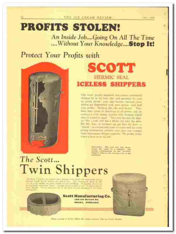 Original 1928 ice cream trade vintage magazine ad for the SCOTT MANUFACTURING COMPANY. Main office and plant were located on 15th at Howard Streets, Omaha, NE.