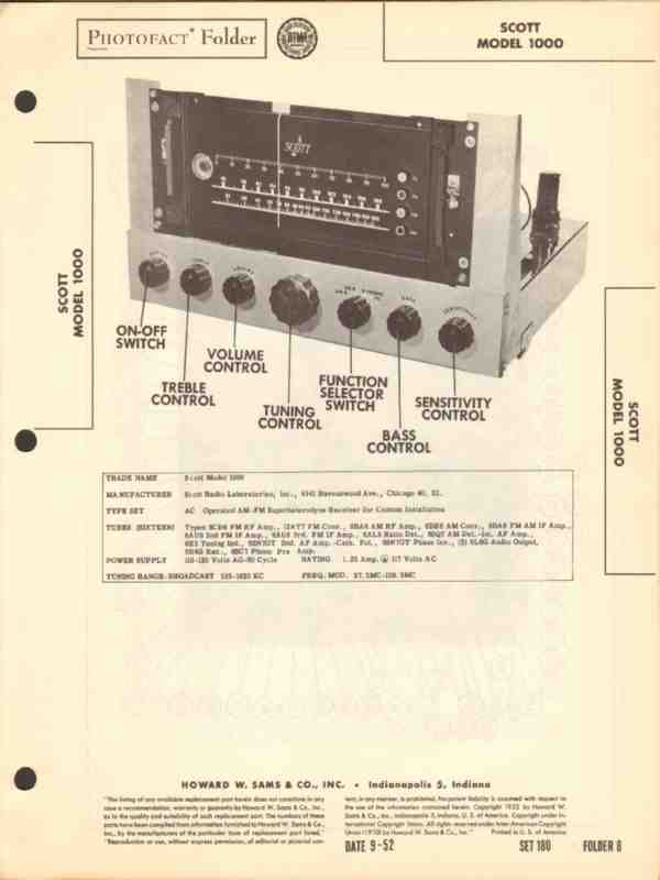Vintage SCOTT model 1000 16 tube Superheterodyne AM FM radio receiver. Original old Sams Photofact manual includes schematic, layout, alignment instructions, voltage & resistance test chart, repair parts list. 10 pages. Dated 1952. Scott Radio Laboratories Inc. of Chicago, IL. This manual would make a sensational accompaniment to your classic radio equipment.