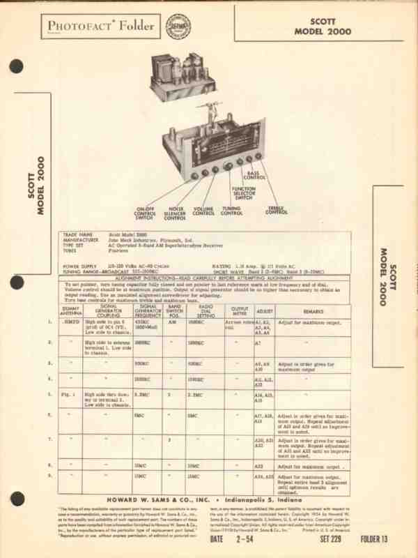 Vintage SCOTT model 2000 14 tube 2 band AM SW radio receiver. Original old Sams Photofact manual includes schematic, layout, alignment instructions, voltage & resistance test chart, repair parts list. 8 pages. Dated 1954. John Meck Industries, Inc., of Plymouth, IN. This manual would make a sensational accompaniment to your classic radio equipment.