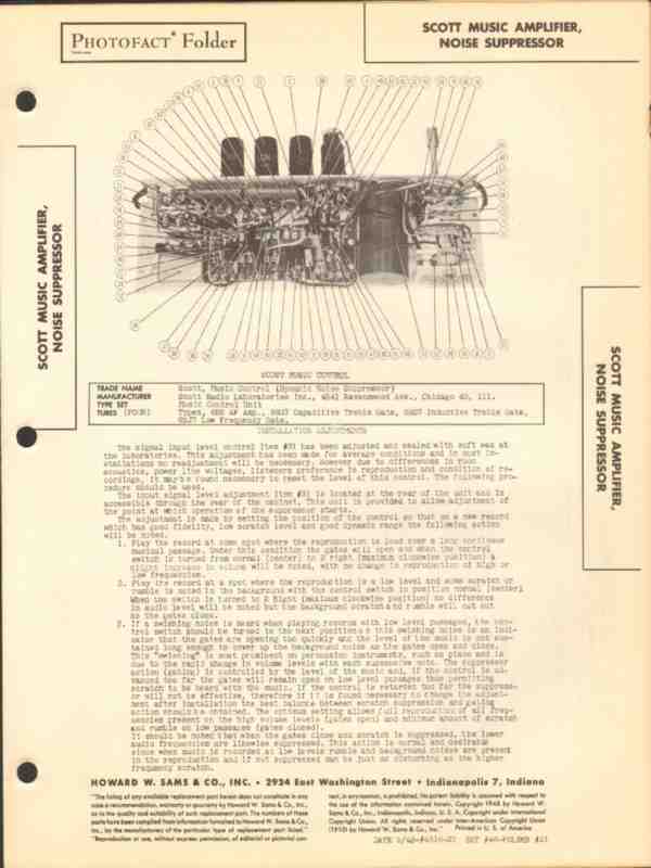 Vintage SCOTT model Music Control Dynamic Noise Suppressor. Original old Sams Photofact manual includes schematic, layouts, voltage & resistance charts, repair parts list. 4 pages. Dated 1948. Scott Radio Laboratories Inc. of Chicago, IL. This manual would make a sensational accompaniment to your vintage audio equipment.