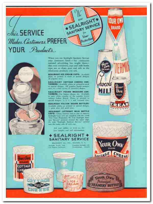 Original ice cream trade magazine vintage ad for SEALRIGHT COMPANY. Main office and factory was located in Fulton, NY. Manufacturers of ice cream containers. Sanitary Service container for your protection. The emblem of a service your customers want, makes customers prefer your products. This unique 1933 old two-sided dairy industry magazine advertisement would display wonderful matted and framed. Nice graphics.