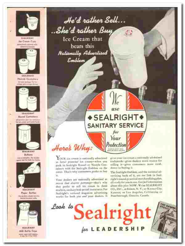 Original 1938 ice cream vintage magazine ad for the SEALRIGHT COMPANY, INC. Main office and plants were located in Fulton, NY, Kansas City, KS and Los Angeles, CA.