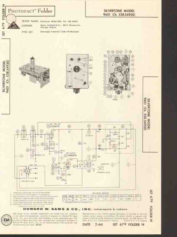 Vintage SEARS SILVERTONE models 9651 (Chassis 528.54930) 1 tube FM multiplex unit. Original old Sams Photofact manual includes schematics, layouts, alignment adjustments, parts list. 2 pages. Dated 1964. Sears, Roebuck & Company of Chicago, IL. This manual would make a sensational accompaniment to your vintage audio equipment.