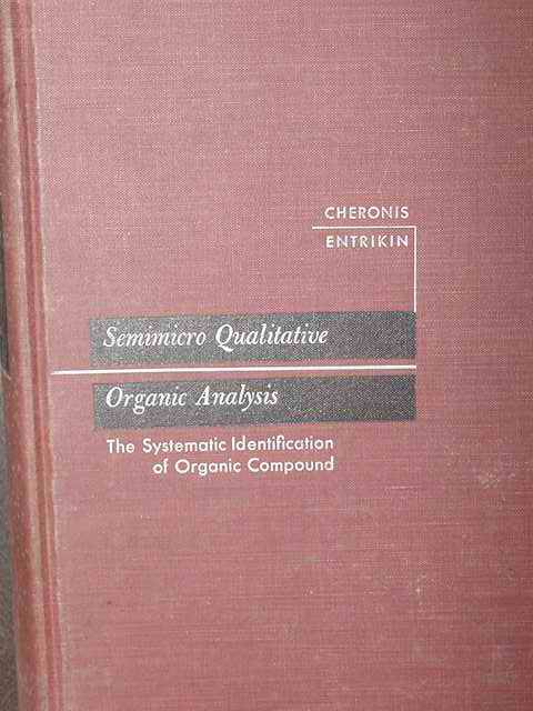 Hard covered book titled SEMIMICRO QUALITATIVE ORGANIC ANALYSIS, THE SYSTEMATIC IDENTIFICATION OF ORGANIC COMPOUNDS by Nicholas Cheronis and John Entrikin, 1957, Second Edition, 774 pages.