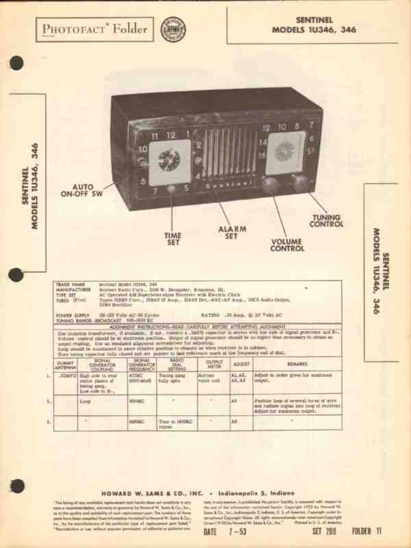 Vintage SENTINEL models 1U346 and 346 5 tube Superheterodyne AM radio receiver with electric clock. Original old Sams Photofact manual includes schematic, layout, alignment instructions, voltage & resistance test chart, repair parts list. 11 pages. Dated 1953. Sentinel Radio Corp., of Evanston, IL. This manual would make a sensational accompaniment to your classic radio equipment.
