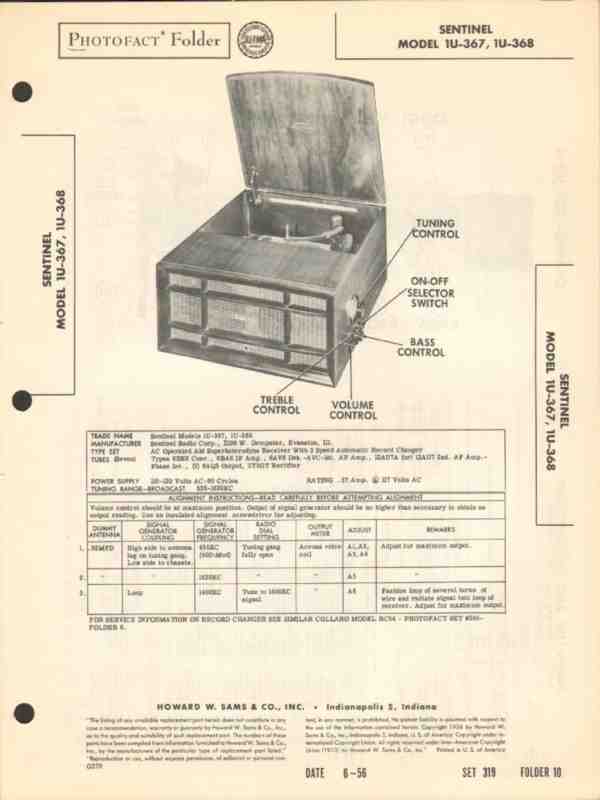 sentinel model 1u367 1u368 am radio phonograph sams photofact manual