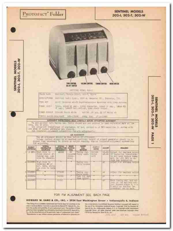 Sentinel model 302-I 302-T 302-W AM FM radio Sams Photofact manual