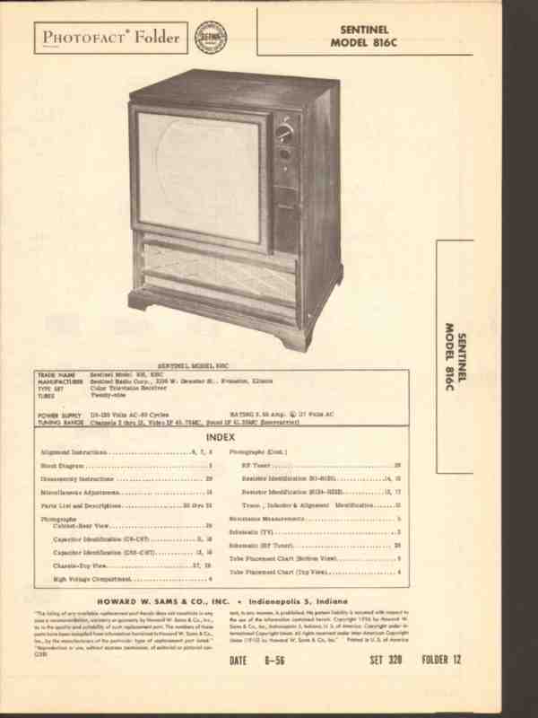 Vintage SENTINEL model 816C 29 tube TV television receiver. Original old Sams Photofact manual includes schematic, layout, alignment instructions, voltage & resistance test chart, repair parts list and description. 29 pages. Dated 1956. Sentinel Radio Corp., of Evanston, IL. This manual would make a sensational accompaniment to your classic video TV equipment.