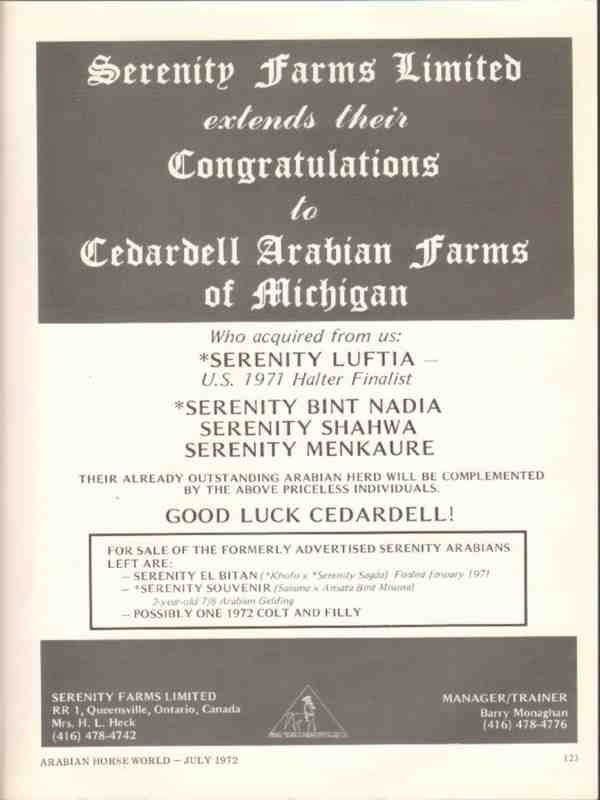 Original old equestrian trade magazine vintage ad for SERENITY FARMS LIMITED in Queensville, Ontario, CA. Serenity Luftia, Bint Nadia, Shahwa, Menkaure bought by Cedardell Arabian Farms of Michigan. Left for sale ore El Bitan, sire Khofo and dam Sagda, and Souvenir, sire Salama and dam Ansata Bint Misuna. This unique 1972 Arabian horse breeding advertisement would display beautifully matted and framed.