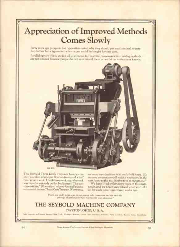 Original old magazine vintage ad for SEYBOLD MACHINE COMPANY in Dayton, OH. Improved Three-Knife Trimmer handles the entire edition of one publication in six and a half hours every week. Printing press equipment.