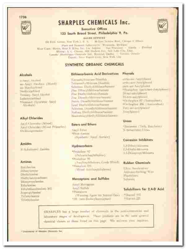 Original 1948 industrial chemical trade vintage catalog for SHARPLES CHEMICALS, INC. Executive office was located at 123 South Broad Street, Philadelphia, PA. The plant and research laboratory were located in Wyandotte, MI.