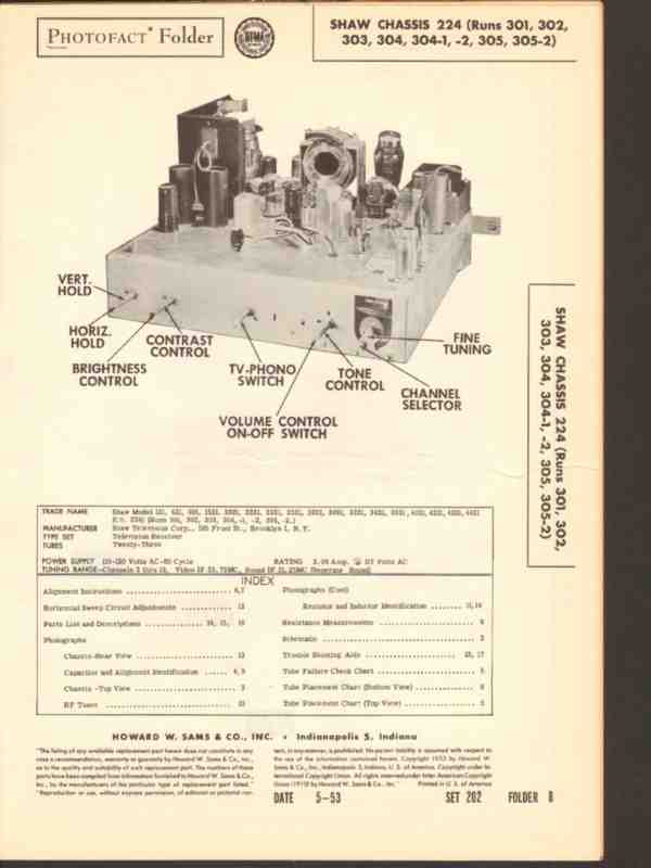Vintage SHAW chassis 224 (Runs 301, 302, 303, 304, 304-1, 304-2, 305, 305-2) (models 121, 421, 921, 1521, 2021, 2221, 2321, 2521, 2621, 3021, 3321, 3421, 3521, 4021, 4221, 4321 and 4421) TV television receiver. Original old Sams Photofact manual includes schematic, layout, alignment instructions, voltage & resistance test chart, repair parts list. 19 pages. Dated 1953. Shaw Television Corp., of Brooklyn, NY. This manual would make a sensational accompaniment to your classic video TV equipment.