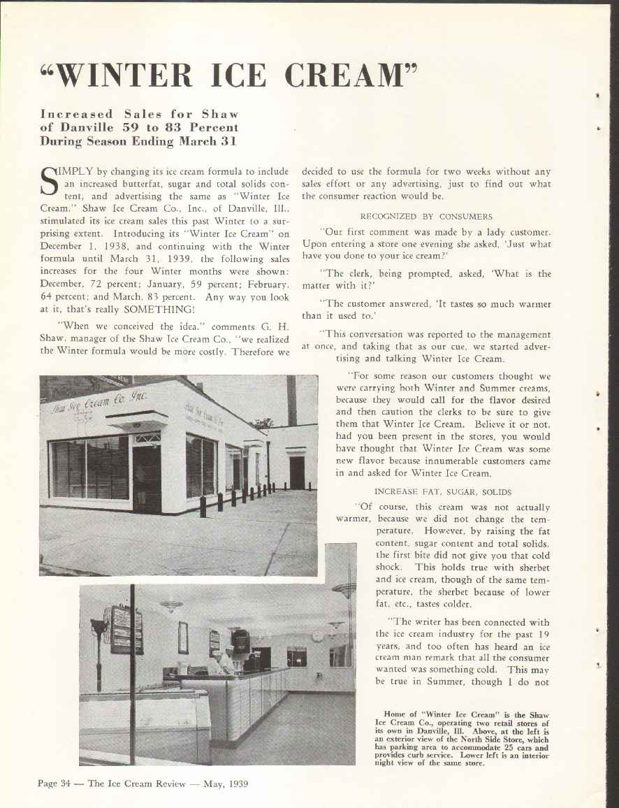 Simply by changing its ice cream formula to include an increased butterfat, sugar and total solids content and advertising the same as Winter Ice Cream, the Shaw Ice Cream Company, Inc, of Danville, IL, stimulated its ice cream sales this past Winter to a surprising extent. Introducing its Winter Ice Cream on December 1, 1938 and continuing with the Winter formula until March 31, 1939.