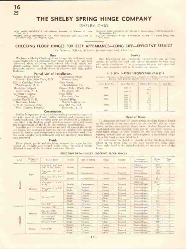 Shelby Spring Hinge Company 1941 Vintage Catalog Hardware Check Floor