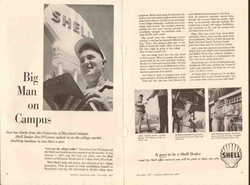 Original old retail petroleum trade magazine vintage ad for SHELL OIL COMPANY. Jim O'Connor, Shell Dealer, has service station just two blocks from the University of Maryland campus in College Park, MD, on Baltimore Boulevard. Cashed in on the college market. Big Man on Campus. This unique 1957 two page gatefold oil and gas advertisement would display beautifully matted and framed.