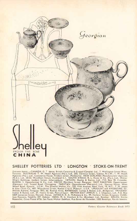 Original pottery vintage ad for SHELLEY POTTERIES LTD. Georgian English fine bone china. Overseas agents in Canada, Australia, New Zealand, South Africa, Pakistan, Barbados, British East Africa, Jamaica, and India.