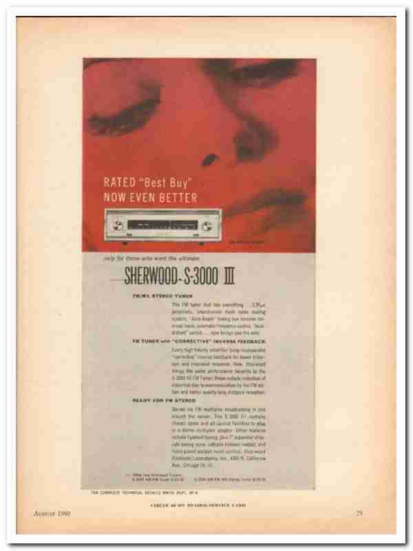 Original vintage ad for SHERWOOD ELECTRONIC LABS INC. S-3000 FM MX Stereo tuner rated Best But, now even better. The tuner that has everything, sensitivity, Interchannel Hush noise muting system, Acro-Beam tuning eye cascode balance input, corrective inverse feedback.