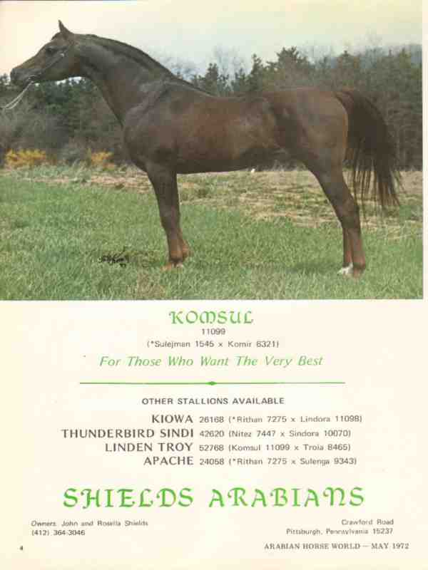 Original old equestrian trade magazine vintage ad for SHIELDS ARABIANS in Pittsburgh, PA. Komsul 11099, sire Sulejman, dam Komir. Up for stud for those who want the very best. Other stallions available Kiowa sire Rithan dam Lindora, Thuderbird Sindi, sire Nitez dam Sindora, Linden Troy sire Komsul dam Troia, and Apache sire Rithan dam Sulenga. Owners John and Rosella Shields. Photo by Polly Knoll. This unique 1972 Arabian breeding advertisement would display beautifully matted and framed.