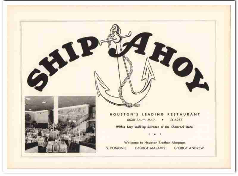 Original 1953 Greek-American business trade magazine vintage ad for SHIP AHOY RESTAURANT. Was located at 6638 South Main Street, in Houston, Texas. Houston Leading Restaurant. Welcome to Houston Brother Ahepans. S. Pomonis, George Malavis and George Andrew, Owners. Within easy walking distance of the Shamrock Hotel.