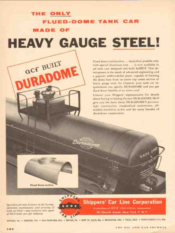 Original old petroleum transportation trade magazine vintage ad for SHIPPERS CAR LINE CORPORATION of New York City, NY. The Only Flued-Dome Tank Car Made of Heavy Gauge Steel. Duradome SHPX train shipping container. This unique 1955 oil and gas industry advertisement would display beautifully matted and framed.