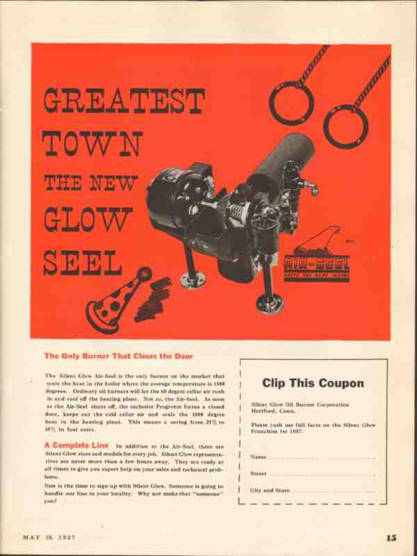 Original oil and gas trade magazine vintage ad for SILENT GLOW OIL BURNER CORPORATION of Hartford, CT. Air-Seel Closes the Door, Seals Heat in the Boiler. This unique 1937 old heating equipment industry magazine advertisement would display beautifully matted and framed.