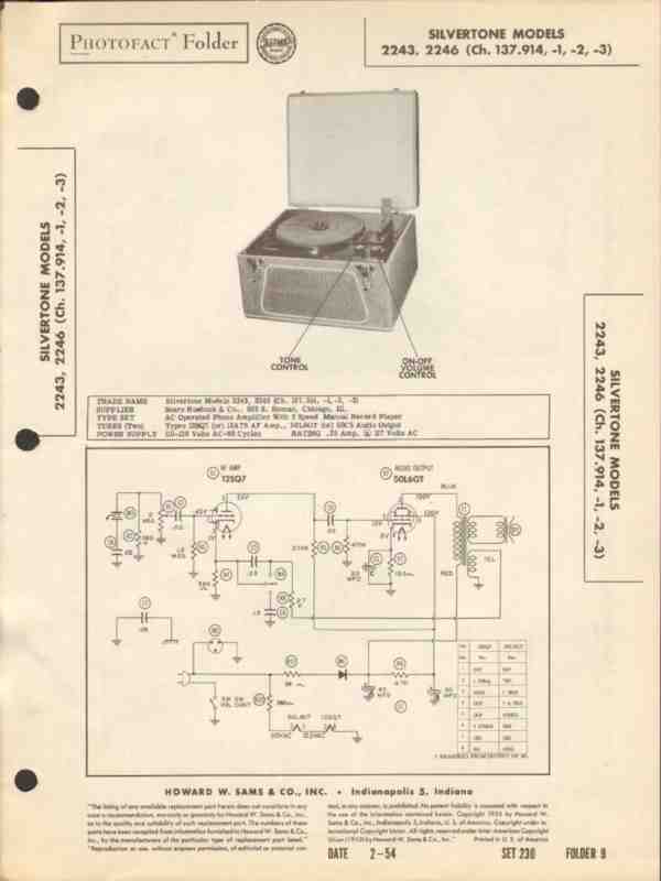 Vintage SILVERTONE models 2243 and 2246 (Ch. 137.914, 137.914-1, 137.914-2, 137.914-3) 3-speed phonograph record player. Original old Sams Photofact manual includes schematic, layout, alignment instructions, voltage & resistance test chart, repair parts list. 2 pages. Dated 1954. Sears, Roebuck & Company of Chicago, IL.This manual would make a sensational accompaniment to your classic audio equipment.