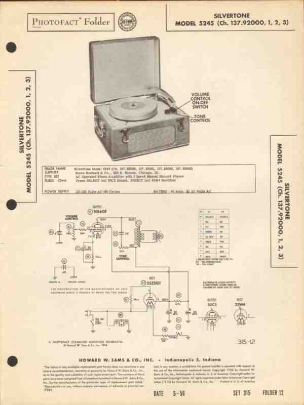 Vintage SILVERTONE model 5245 (Ch. 137.92000, 137.92001, 137.92002 and 137.92003) 3-speed record player phonograph. Original old Sams Photofact manual includes schematic, layout, voltage & resistance test chart, repair parts list and description. 2 pages. Dated 1956. Sears, Roebuck & Company of Chicago, IL.