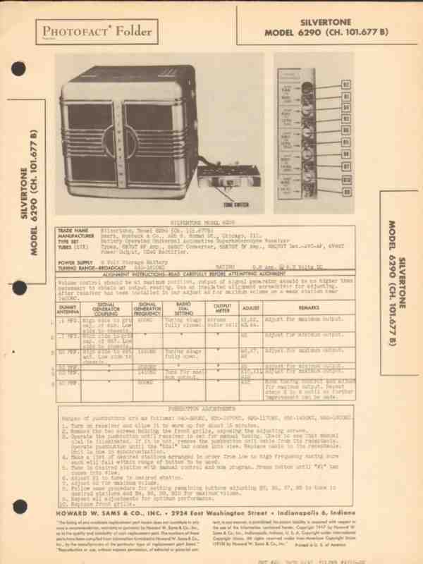 Vintage SILVERTONE models 6290 (Ch. 101.677B) 6 tube Superheterodyne AM car radio receiver. Original old Sams Photofact manual includes schematic, layout, alignment instructions, voltage & resistance test charts, repair parts list and description. 4 pages. Dated 1947. Sears, Roebuck & Company of Chicago, IL. This manual would make a sensational accompaniment to your classic retro radio equipment.