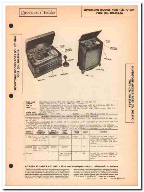 Vintage Radio Service Manual - SILVERTONE model 7085 (Chassis No.101.814) model 7102 (Chassis No. 101.814-1A) 8-tube Superheterodyne AM radio receiver with wire recorder and phonograph record player combination. Manufactured by Sears, Roebuck & Company, of Chicago, IL. Dated 1947. 8 pages. Original old Sams Photofact manual includes schematic, layout, alignment instructions, voltage & resistance test chart, repair parts list and description. This manual would make a sensational accompaniment to your retro phono equipment.