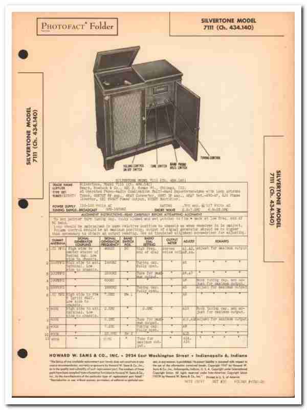 Vintage Radio Service Manual - SILVERTONE model 7111 (Chassis No. 434.140) 8-tube Superheterodyne AM SW radio receiver with phonograph record player combination. Manufactured by Sears, Roebuck & Company, of Chicago, IL. Dated 1947. 6 pages. Original old Sams Photofact manual includes schematic, layout, alignment instructions, voltage & resistance test chart, repair parts list and description. This manual would make a sensational accompaniment to your retro phono equipment.