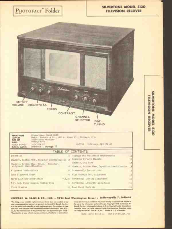 Vintage SILVERTONE model 8130 25 tube TV television receiver. Original old Sams Photofact manual includes schematic, layouts, alignment adjustments, repair parts list. 16 pages. Dated 1948. Sears, Roebuck & Company of Chicago, IL. This manual would make a sensational accompaniment to your vintage audio equipment.