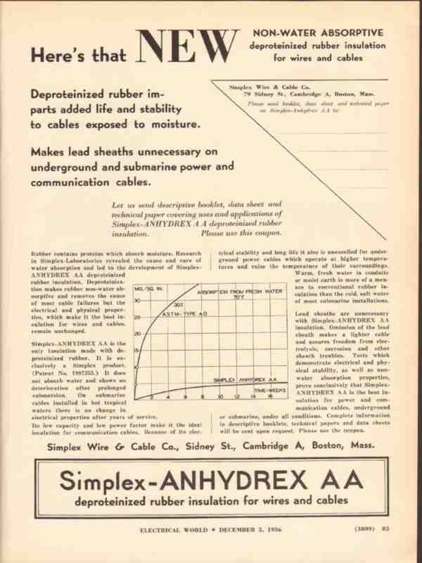 Original old electrical industry trade magazine ad for SIMPLEX WIRE AND CABLE COMPANY of Boston, MA. Deproteinized Rubber Imparts Added Life and Stability to Cables Exposed to Moisture. Simplex-Anhydrex AA Rubber Insulation for Wires and Cables. This 1936 industry magazine advertisement would display beautifully matted and framed.