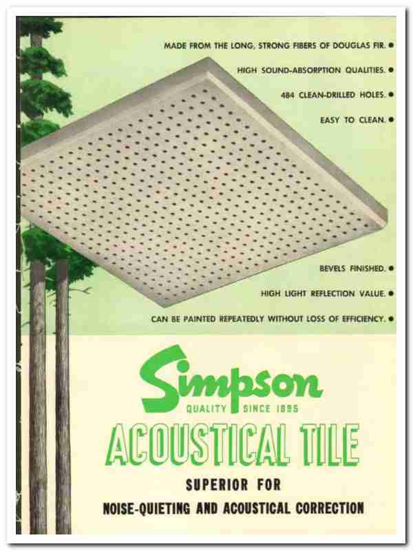 Developed by its research laboratory, Simpson presents and improved acoustical tile of superior sound absorbing properties and decorative beauty. Simpson research, first to take advantage of the long, strong fibers of sturdy Douglas fir, developed a new manufacturing process to create this new and improved acoustical material. It is produced in a new, modern plant equipped with the latest design controls to insure a high degree of uniformity and quality.
