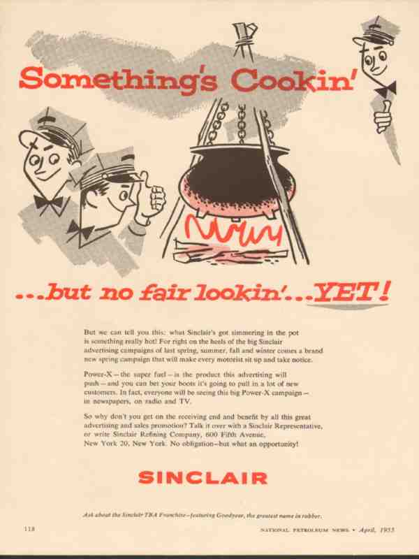 Original oil and gas trade magazine vintage ad for SINCLAIR REFINING COMPANY, was located at 600 Fifth Avenue, New York City, NY. Something's Cooking But No Fair Looking, Yet! Sinclair's got something really hot. Power-X Super Fuel. Unique 1955 old petroleum products process gasoline service station magazine advertisement.