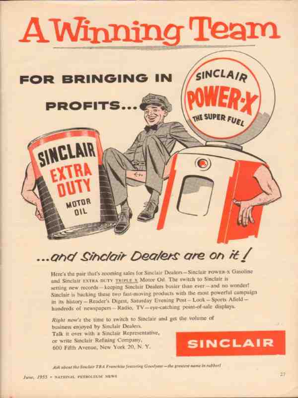 Original oil and gas trade magazine vintage ad for SINCLAIR REFINING COMPANY, was located at 600 Fifth Avenue, New York City, NY. A Winning Team for Bringing in Profits, Sinclair Extra Duty Motor Oil, Sinclair Power-X Super Fuel, and Sinclair Dealers are On it! This unique 1955 old petroleum products gasoline service station industry magazine advertisement would display fantastic matted and framed.