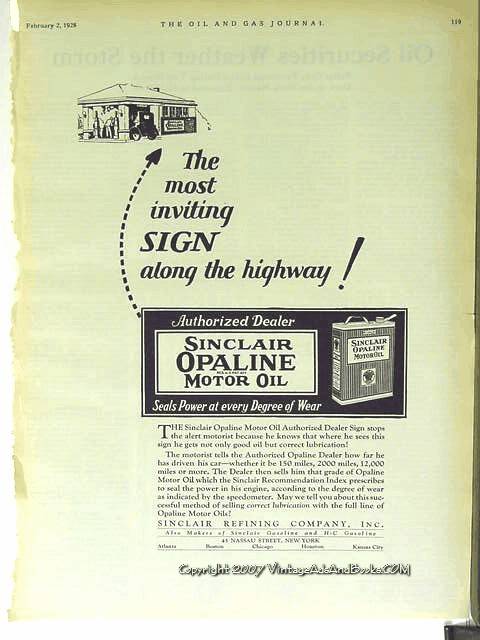 Original oil and gas trade magazine vintage ad for SINCLAIR REFINING COMPANY, INC., was located at 45 Nassau Street, New York City, NY. Branch Offices were located in Atlanta, Boston, Chicago, Houston and Kansas City. The Most Inviting Sign along the Highway! Sinclair Opaline Motor Oil. This unique 1928 old petroleum products refining gasoline service station industry magazine advertisement would display fantastic matted and framed.