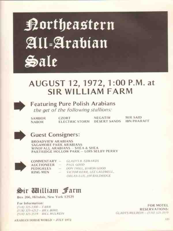 Original old equestrian trade magazine vintage ad for SIR WILLIAM FARM in Hillsdale, NY. Northeastern All-Arabian Sale. Featuring Pure Polish Arabians, the get of the following stallions, Sambor, Nabor, Czort, Electric Storm, Negatiw, Desert Sands, Mir Said, Ibn Pharaff. Guest Consigners are Broadview Arabians, Sagamore Park, Windfall, Shea and Shea, Partridge Hollow Park, Lois Selby Perry. Commentary Gladys Edward, Auctioneer Paul Good, Pedigrees Don Thiel and Byron Good, Ring Men Victor Kerr, lee Caldwell, Orlan Lux and Jim Baldridge. For information see Bill Bohl and Bill Mulrein. This unique 1972 Arabian horse breeding advertisement would display beautifully matted and framed.