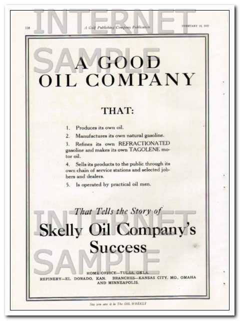 Original oil and gas trade magazine vintage ad for SKELLY OIL COMPANY of Tulsa, OK. A Good Oil Company That Produces Its Own Oil, Manufacturers Its Own Natural Gasoline. This unique 1927 old petroleum refining process service station industry magazine advertisement would display magnificently matted and framed.