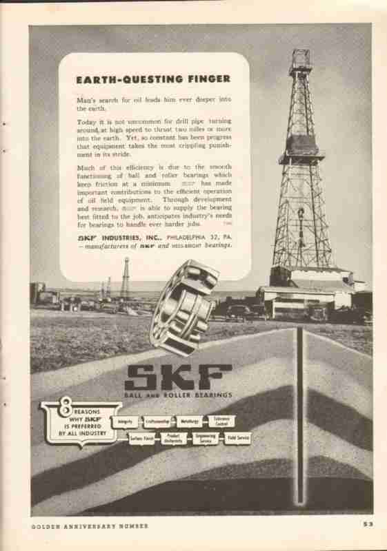 Original oil and gas trade magazine vintage ad for SKF INDUSTRIES, INC, of Philadelphia, PA. Earth-Questing Finger. SKF Ball and Roller Bearings. This unique 1951 old petroleum oilfield drilling rig and pumping equipment magazine advertisement would look sensational matted and framed.