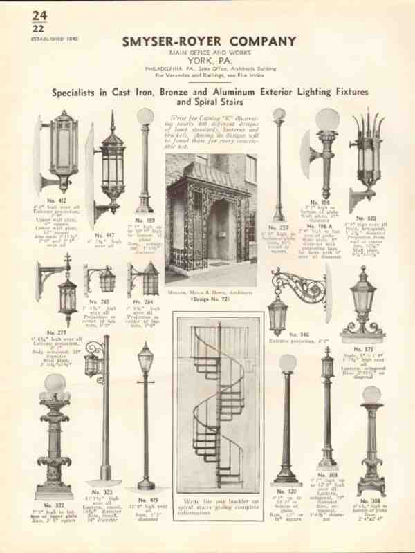 Original electrical trade vintage catalog for SMYSER-ROYER COMPANY, Main office and works was located in York, PA. Manufacturers of Exterior Lighting Fixtures and Spiral Stairs in Cast Iron, Bronze and Aluminum. Mellor, Meigs and Howe, Architects, Design No. 72. metal lamp standard, lanterns and brackets. Disbound from a large 1938 electrical construction materials book, this unique old one page technical brochure would display wonderfully matted and framed. A marvelous addition to your retro electric lighting equipment library.