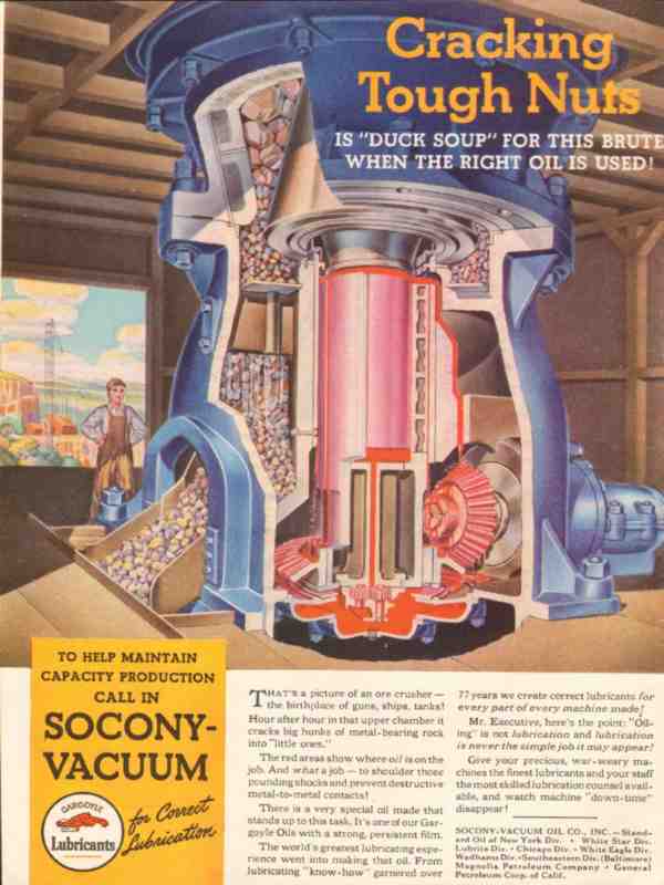 Original World War 2 lubrication industry trade magazine vintage ad for SOCONY VACUUM OIL COMPANY. Main office was located in New York City, NY. Cracking Tough Nuts is Duck Soup for This Brute When The Right Oil is Used! An ore crusher, the birthplace of guns, ships, tanks. World's greatest lubricant. Unique old 1943 WW2 wartime era propaganda petroleum products magazine advertisement.