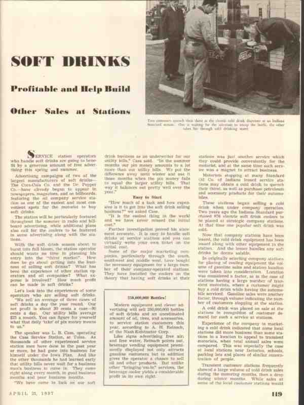 Original old petroleum trade magazine vintage article for SOFT DRINKS profitable and help build other sales at service station. Coca-Cola and Dr Pepper Company have began to appear in newspapers, magazines and on billboards featuring the oil company service stations as one of the easiest and most convenient spots for the motorist to buy sodas. Pictured are two customer quenching their thirst at the electric cold drink dispenser. This unique 1937 gasoline three page article would display beautifully matted and framed.