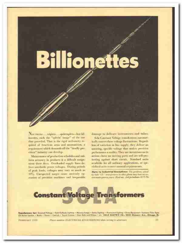 Sola Electric Company 1943 vintage ad transformer voltage billionettes