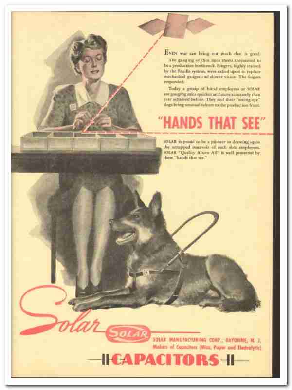 Even war can bring out much that is good. The gauging of thin mica sheets threatened to be a production bottleneck. Fingers, highly trained by the Braille system, we called upon to replace mechanical gauges and slower vision. The fingers responded. Today, a group of blind employees at Solar are gauging mica quicker and more accurately than ever achieved before. They and their seeing-eye dogs bring unusual talents to the production front.