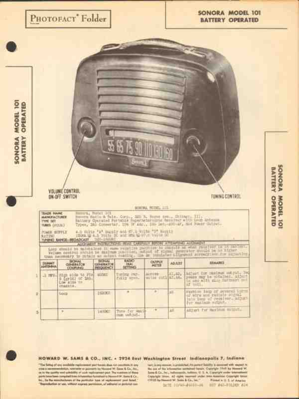 Vintage SONORA model 101 4 tube battery operated portable Superheterodyne AM radio receiver. Original old Sams Photofact manual includes schematic, layouts, alignment, adjustments, repair parts list. 4 pages. Dated 1948. Sonora Radio & Tele. Corp of Chicago, IL. This manual would make a sensational accompaniment to your vintage audio equipment.