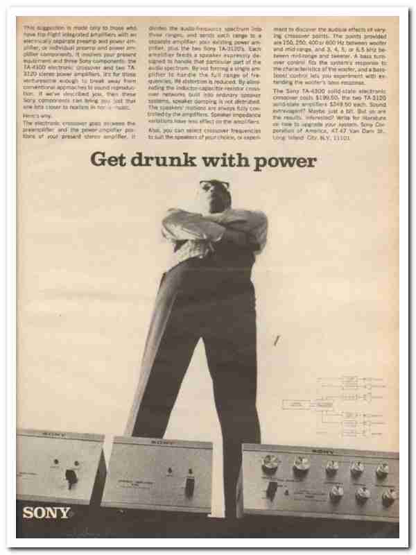Original vintage ad for SONY CORPORATION OF AMERICA. TA-4300 electronic crossover, TA-3120 amplifier. Get drunk with power. The crossover goes between the preamplifier and the power-amplifier portions of your present stereo amplifier. It divides the audio-frequency spectrum into three ranges, and sends each range to a separate amplifier, your existing power amplifier, plus the two Sony TA-3120's. Each feeds a speaker expressly designed to handle that particular part of the audio spectrum.