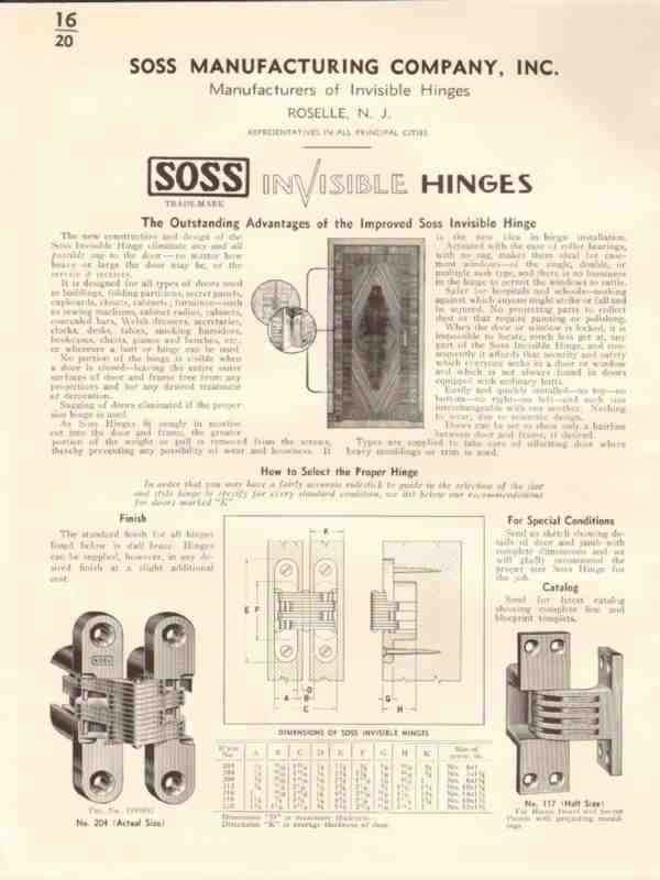 Soss Mfg Company 1941 Vintage Catalog Hardware Invisible Hinges Door
